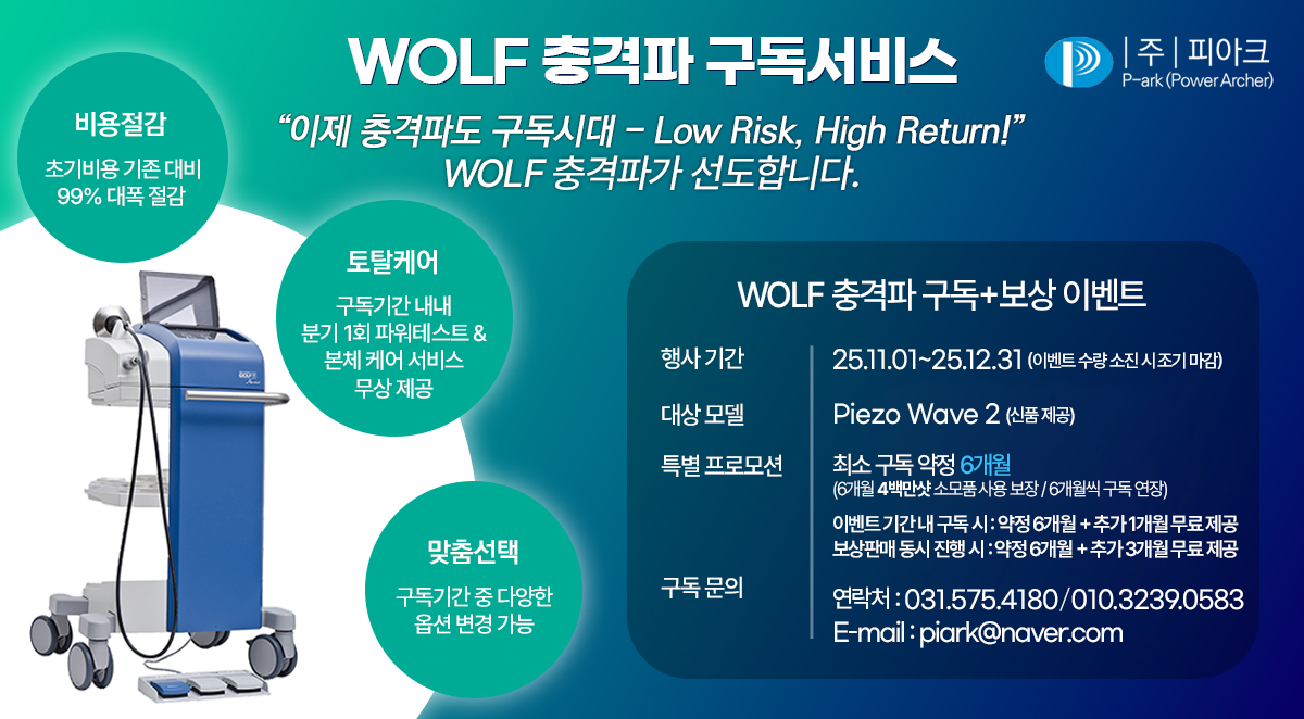 피에조압전방식을(Piezoelectric Shock wave) 개발한 독일 울프사의 Focus type 체외충격파 High-end Model 입니다.